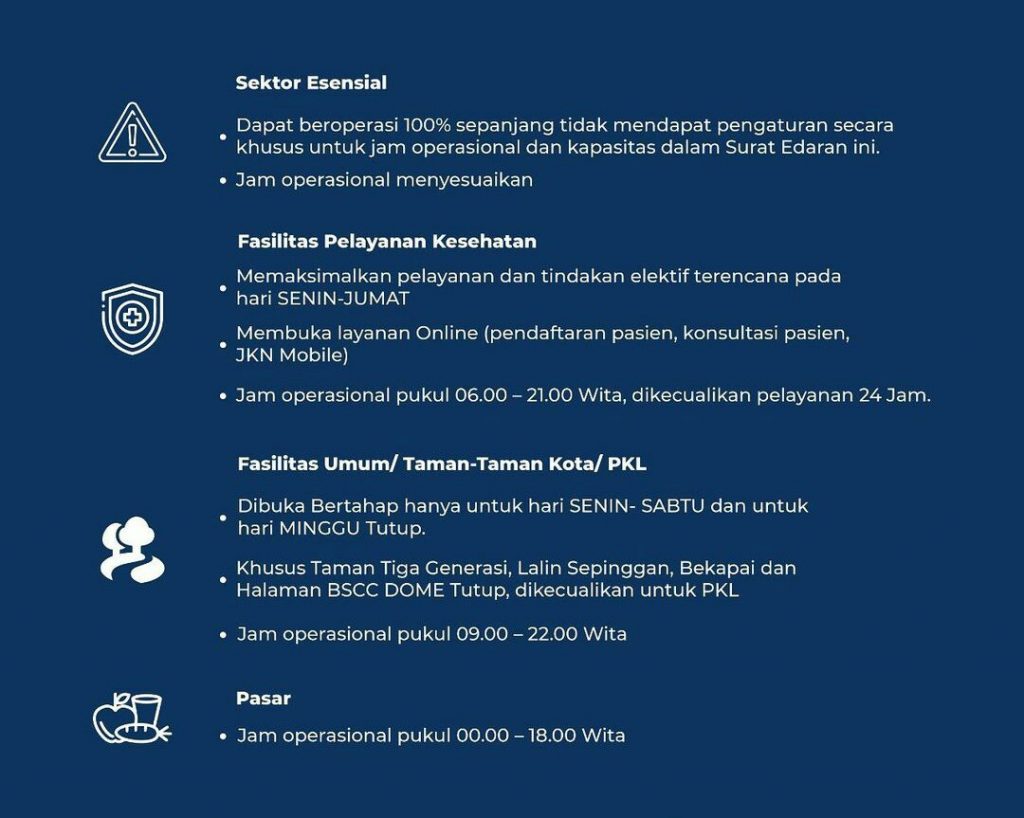 Dimana pelaku usaha dan fasilitas umum wajib menerapkan protokol ksehatan Memakai masker, jaga jarak, wajib pengukuran suhu, mencuci tangan, menghindari kerumunan, Maksimal 50 persen kapasitas