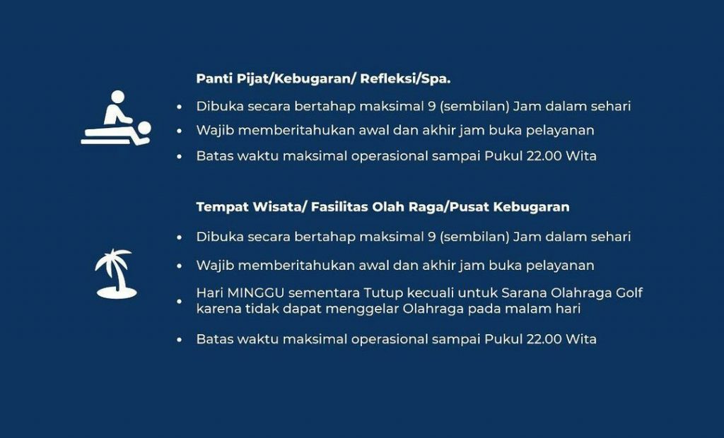 Dimana pelaku usaha dan fasilitas umum wajib menerapkan protokol ksehatan Memakai masker, jaga jarak, wajib pengukuran suhu, mencuci tangan, menghindari kerumunan, Maksimal 50 persen kapasitas.
