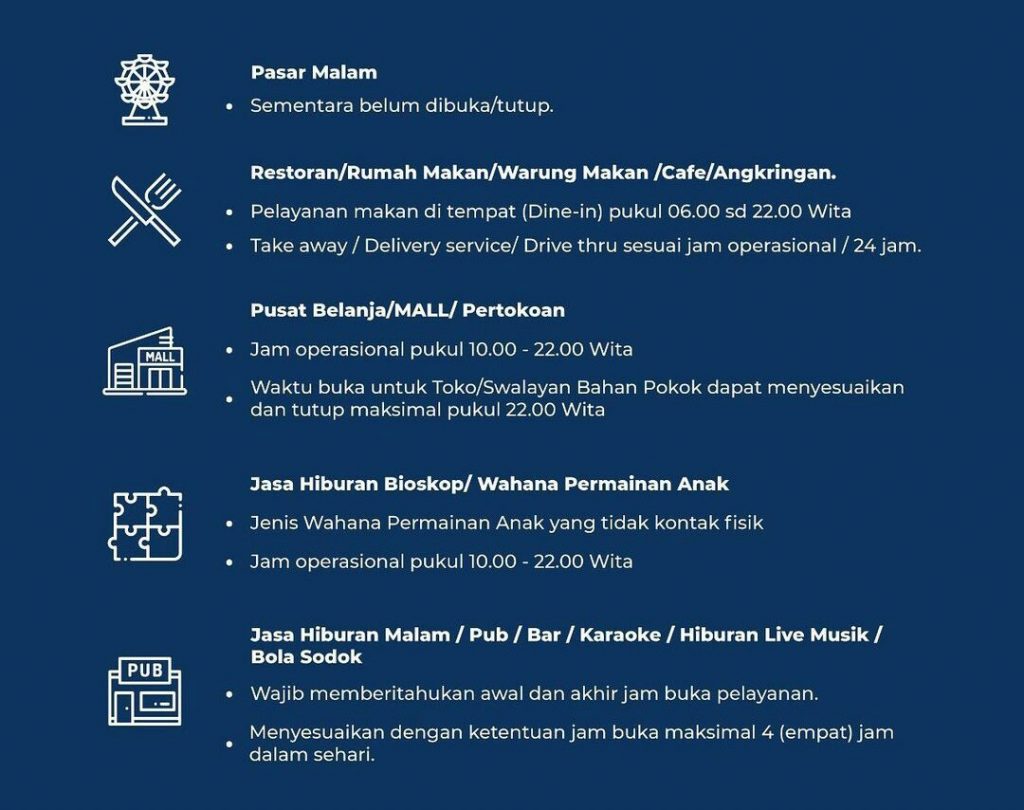 Dimana pelaku usaha dan fasilitas umum wajib menerapkan protokol ksehatan Memakai masker, jaga jarak, wajib pengukuran suhu, mencuci tangan, menghindari kerumunan, Maksimal 50 persen kapasitas