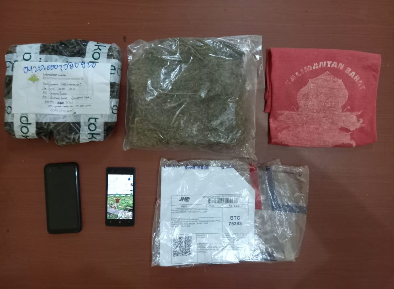 Lanjut Kasat Reskoba, Barang bukti yang terdiri 1 (satu) bungkus plastik berisi ganja dengan berat kotor 235,4 gram, 1 (satu) lembar kaos berwarna merah, 1 (satu) unit HP merek Realmi warna biru, 1 (satu) unit HP merek Oppo warna biru, 1 (satu) buah bungkus paket, dan 1 (satu) buah resi pengiriman barang, juga kami sita.