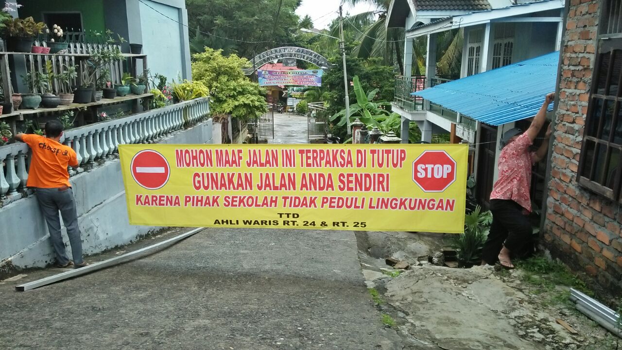 Di sekolah favorit Balikpapan Utara ini, jalan masuk disegel warga dan ahli waris pemilik jalan. Warga memasang spanduk kuning yang menyatakan jalan masuk ditutup.