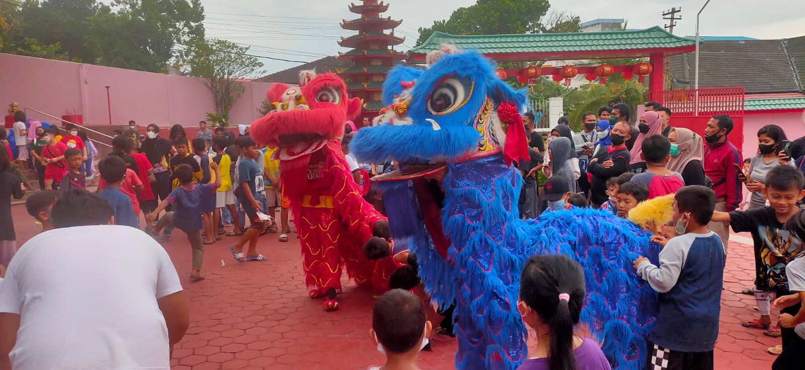 BALIKPAPAN, Inibalikpapan.com – Perayaan tahun baru China tahun ini atau Imlek 2573, Klenteng Guang De Miao Pasar Baru, Balikpapan menggelar atraksi tarian Barongsai, Selasa (01/01/2022).