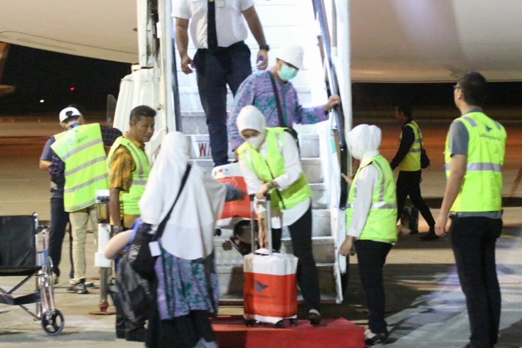 BALIKPAPAN, Inibalikpapan.com – Sekitar pukul 02.10 Wita, jemaah haji kloter 1 Embarkasi Balikpapan asal Kota Balikpapan, Kaltim mendarat di Bandara Sepinggan Balikpapan, Sabtu dinihari (8/7/2023).