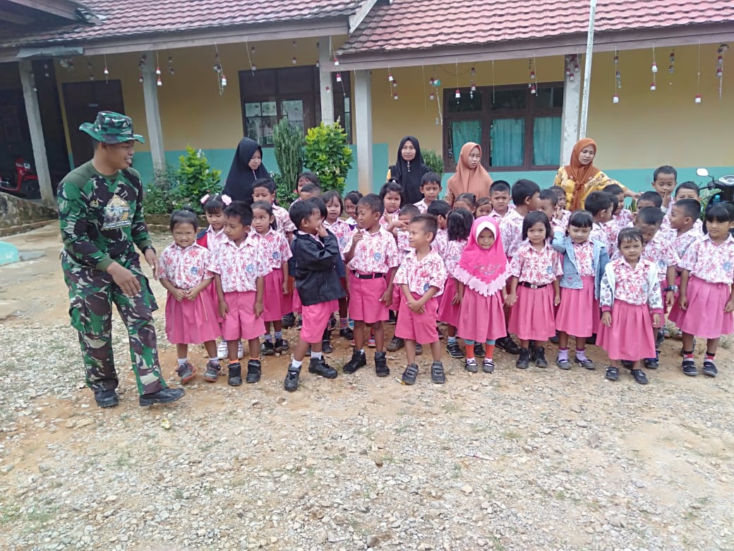 Anggota TNI Kodim 0913 Penajam Paser Utara (PPU) itu memberikan wawasan kebangsaan kepada anak-anak Taman Kanak-kanak (TK) Desa Argomulyo Kecamatan Sepaku, PPU, Kamis (21/03).