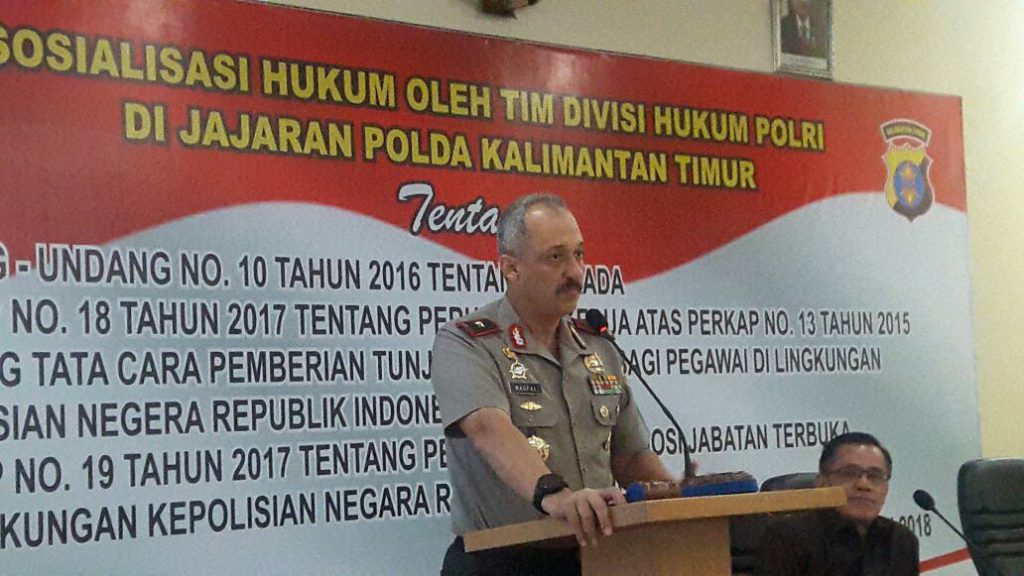 Sosialisasi ini membahas tentang Sosialisasi Hukum oleh Tim Divisi Hukum Polri di Jajaran Polda Kaltim yang temanya membahas tentang Undang undang No 10 Tahun 2016 tentang Pilkada, Peraturan Kapolri No 18 Tahun 2017 tentang perubahan kedua atas perkap No 13 Tahun 2015 tentang cara pemberian tunjangan kinerja bagi pegawai di lingkungan Kepolisian Negara Republik Indonesia.