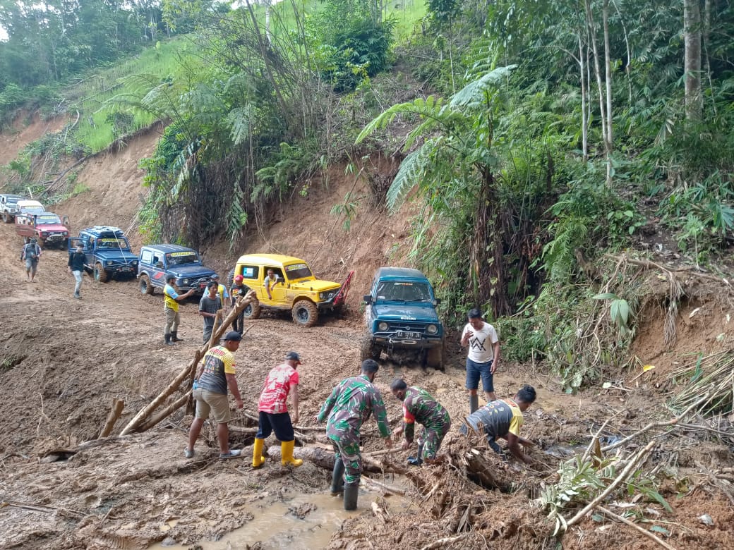 Kendaraan roda empat hanya bisa menempuh perjalanan hingga dusun Lukuran kurang lebih 2 kilometer sebelum desa Datar Ajab.”terang Serda Hartono saat membantu membuka jalan untuk komunitas Jeep yang mengantar logistik ke Datar Ajab.