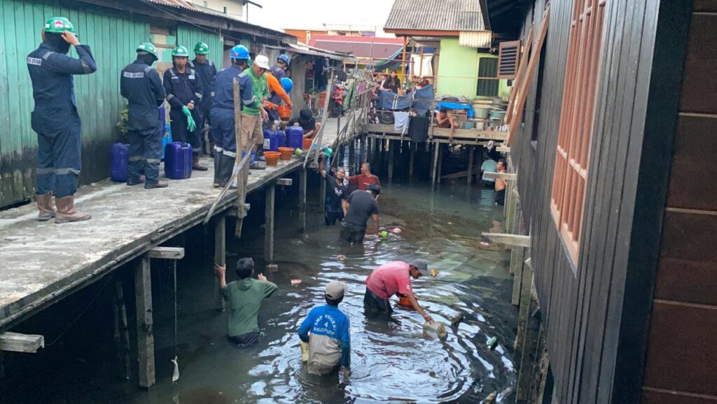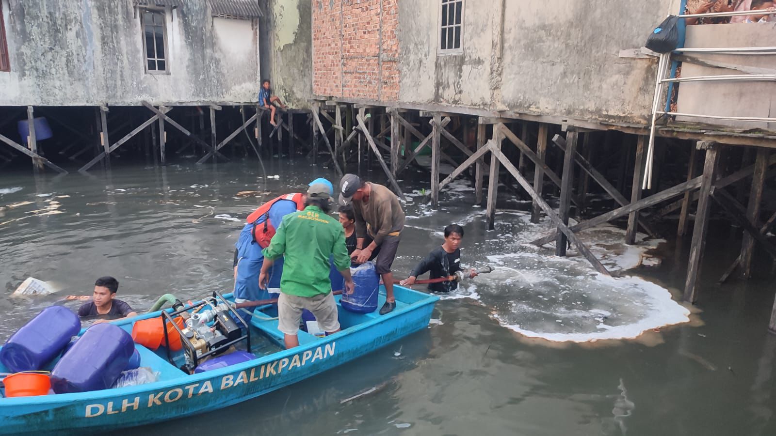 KPI Balikpapan Lakukan Penanganan Cairan Hitam Di Pemukiman Atas Air Margasari, Gunakan Oil Boom