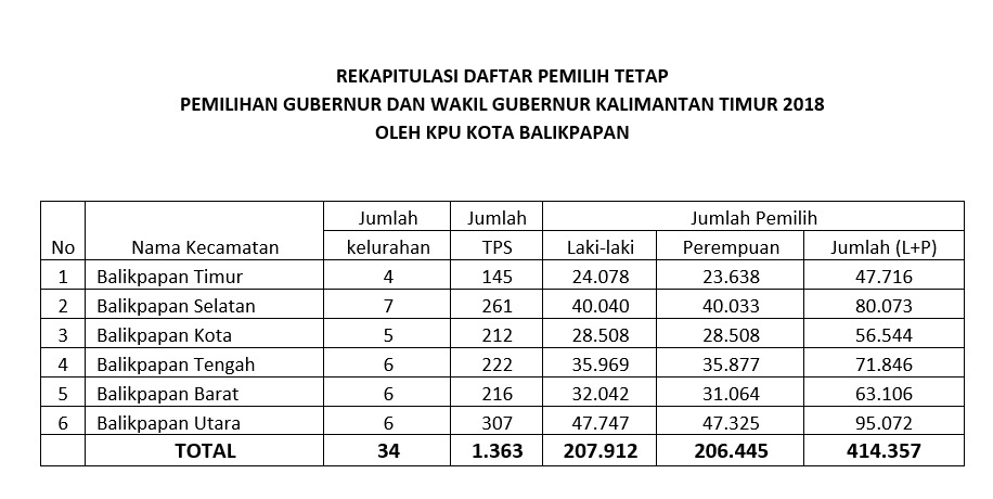 ” DPT jumlah 414.357 pemilih. Kita telah tetapkan jumlah DPT untuk pemilih laki-laki sebesar 207.912 dan jumlah pemilih perempuan sebesar 206.445 yang terdiri dari 6 kecamatan dan 34 kelurahan di Balikpapan,” kata Ketua KPUD Balikpapan Noor Thoha.