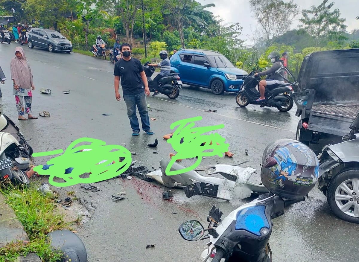 Marwan menambahkan, saat kejadian cuaca hujan sehingga jalan licin, selain itu juga lokasi kecelakaan tepat di jalan menanjak. “Pas saya lihat sudah rebah semua, kemungkinan sepeda motor ditabrak pikap lalu mobil silver tabrak bemper pikap. Korban pengendara motor udah terkapar di jalan,” kata Marwan.