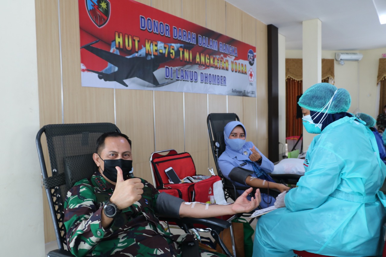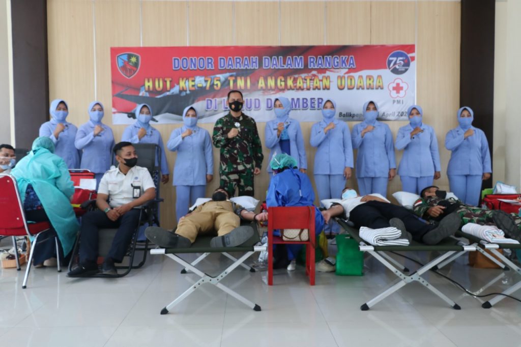 BALIKPAPAN,Inibalikapapan.com — Dalam rangka peringatan ke-75 Hari TNI Angkatan Udara, Lanud Dhomber bekerja sama dengan Palang Merah Indonesia (PMI) kota Balikpapan menggelar kegiatan donor darah yang berlangsung di Guest House Lanud Dhomber, Kamis (1/4/2021).