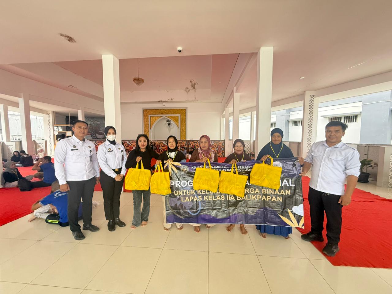 Kegiatan bantuan sosial digelar di ruang besukan Lapas Balikpapan, di mana sejumlah staf turun langsung menyalurkan paket bantuan kepada keluarga warga binaan yang membutuhkan.