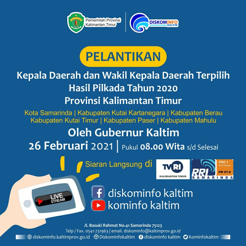 SAMARINDA, Inibalikpapan.com — Pelantikan Kepala Daerah dan Wakil Kepala Daerah Terpilih hasil Pilkada tahun 2020 oleh Gubernur Kalimantan Timur akan dilaksanakan pukul 08.00 wita, Jumat (26/2/2021).