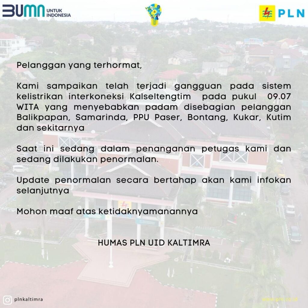 “Kami sampaikan telah terjadi gangguan pada sistem kelistrikan interkoneksi Kalseltengtim pada pukul 09.07 WITA yang menyebabkan pemadaman disebagian pelanggan,”