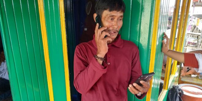 Sudirman memperlihatkan dua hp yakni satu device 2G dan android. “Hp besar ini untuk telpon aja sama dengan yang kecil ini,” katanya sambil mengaku sudah lama menggunakan Telkomsel.