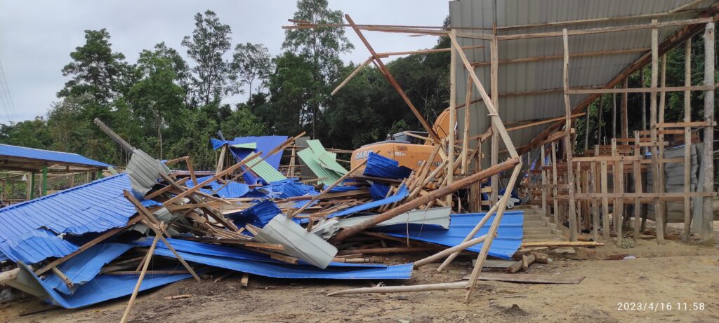 Eskavator PU Balikpapan langsung merobohkan dan meratakan bangunan utama lokasi sabung ayam. Disaksikan Asisten I Pemerintahan Zulkifli yang memimpin pelaksanaan pembongkaran di Km 13 Balikpapan Barat, berbatasan Hutan Lindung Sungai Wain (HLSW).