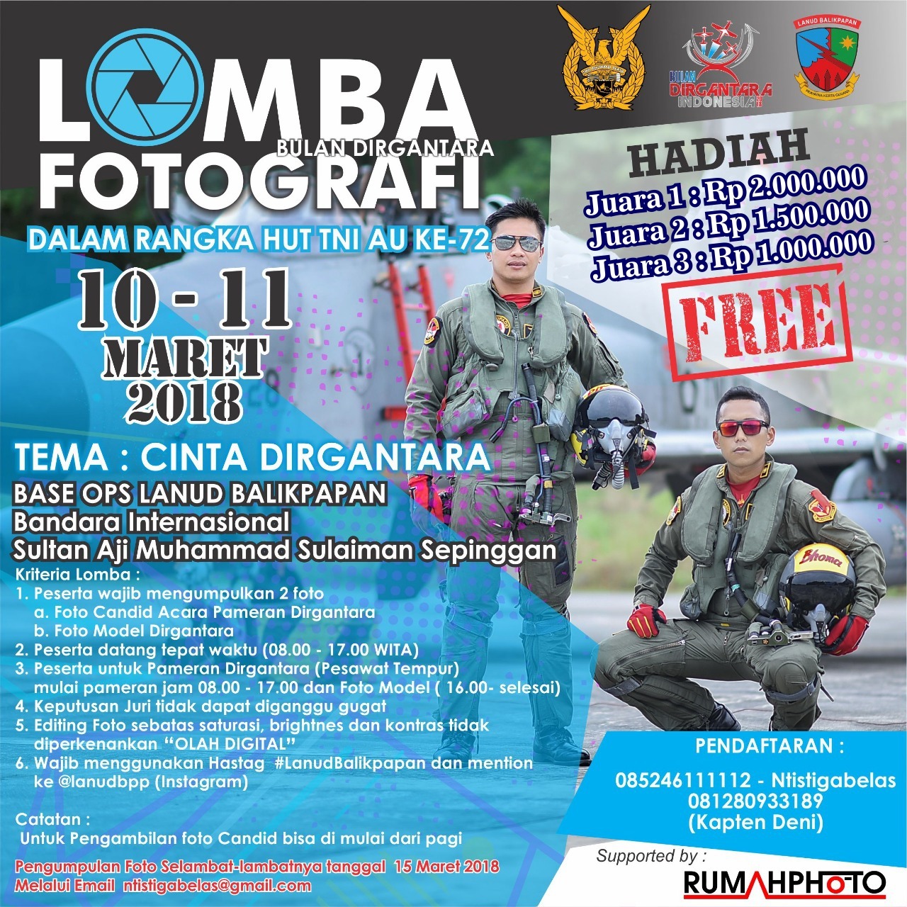 BALIKPAPAN, Inibalikpapan.com – Selain acara static show, dalam rangka memeriahkan Latihan Kilat Cakra dan Operasi Tangkis Petir 2018 di Base Ops, Lanud Balikpapan mengadakan lomba foto “Dirgantara Photography Competition” dengan tema “Cinta Dirgantara” yang dibuka untuk umum.
