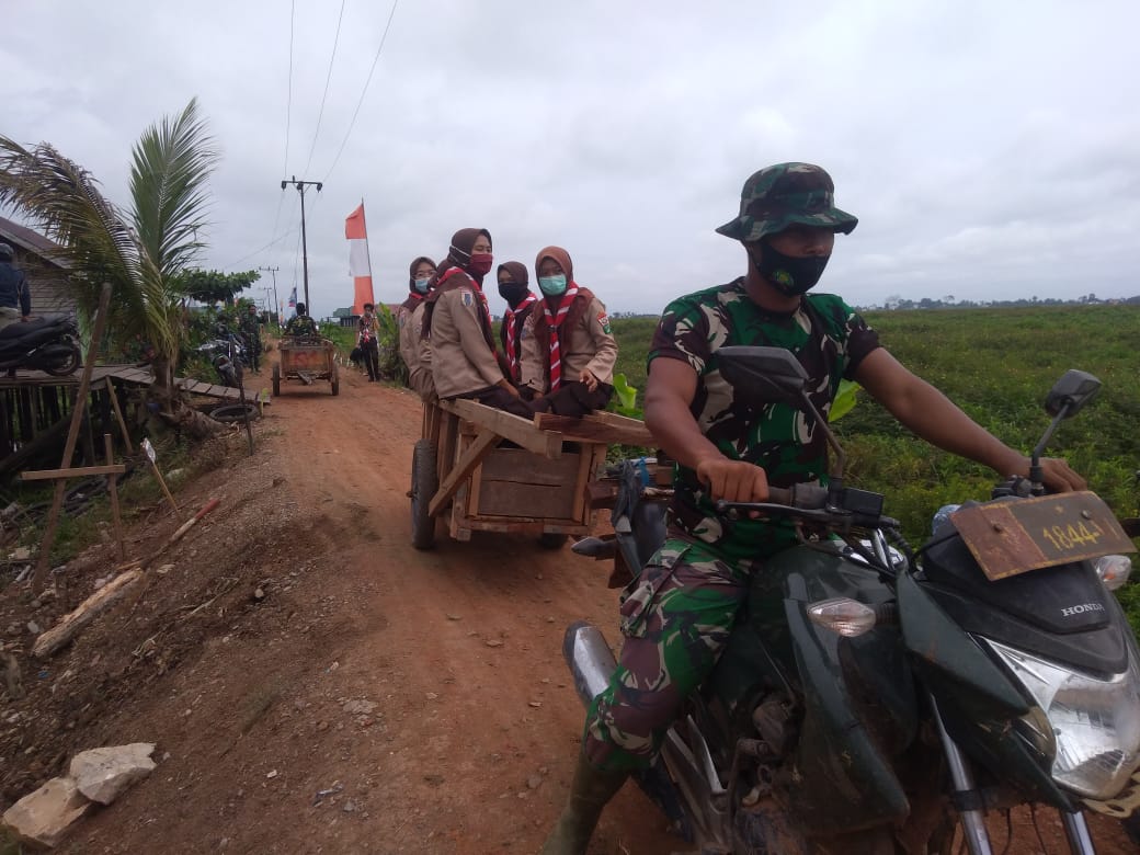 Anak-anak Desa Sarang Burung bersama anggota satgas TMMD menaiki gerobak penarik material saat berangkat dan pulang sekolah, sambil bersenda gurau cerita tawa serta ikut membantu menaikkan dan menurunkan tanah guna untuk menimbun siring yang sudah di bangun. Anak-anak tidak merasa takut bersama Tentara karena selama ini petugas Babinsa dari Koramil Danau Panggang juga sering bersama dengan masyarakat di Desa Sarang Burung.