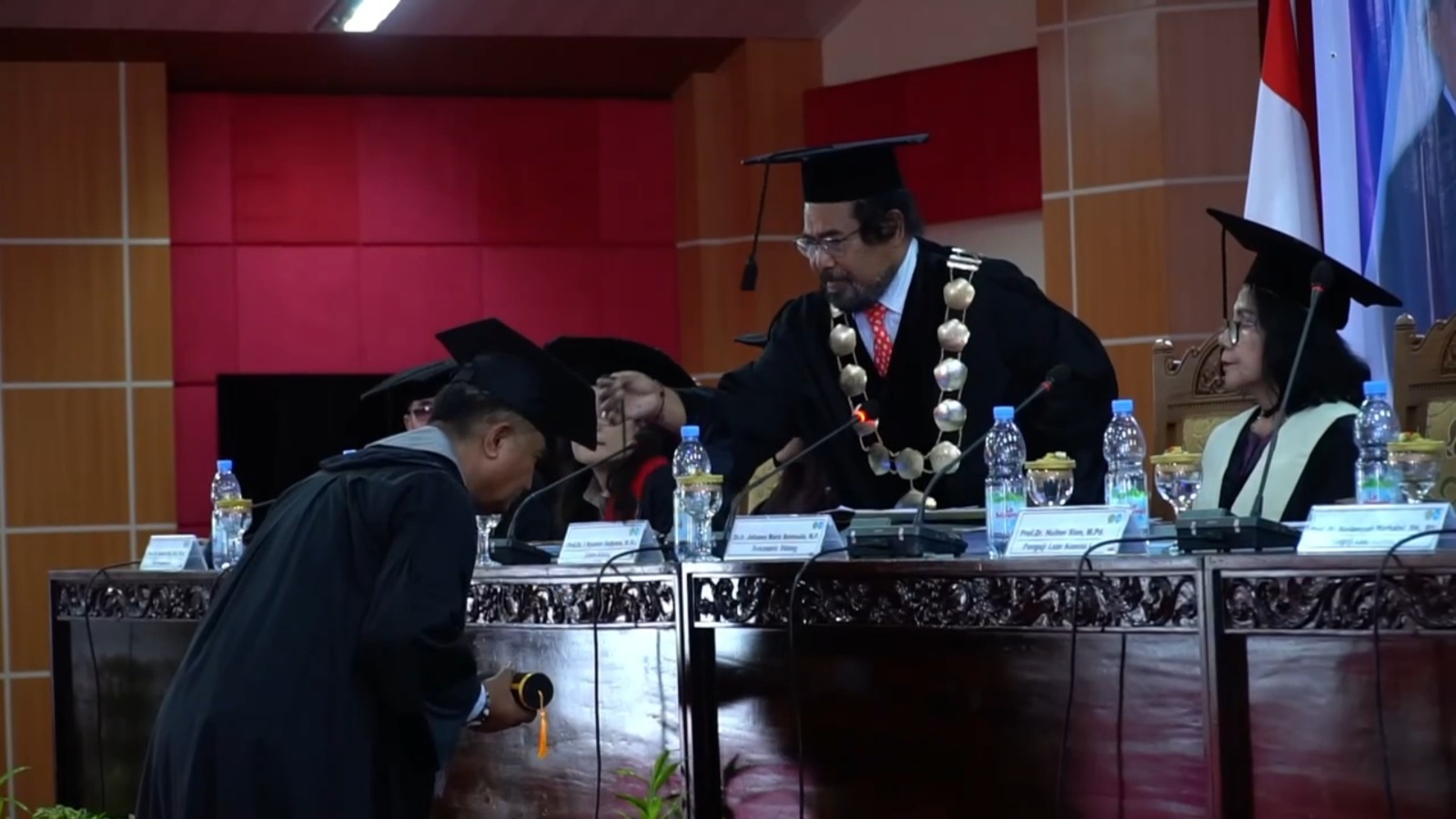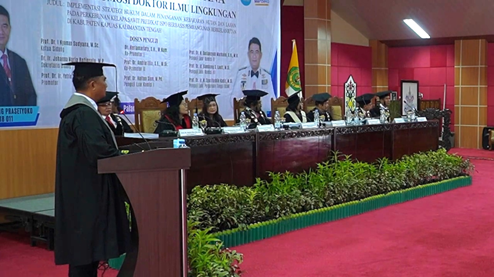 Promovendus Ignatius Agung Prasetyoko mempresentasikan desertasinya dengan judul implementasi strategi hukum dalam penanganan kebakaran hutan dan lahan pada perkebunan kelapa sawit predikat ISPO berbasis pembangunan berkelanjutan di Kabupaten Kapuas Kalimantan Tengah.