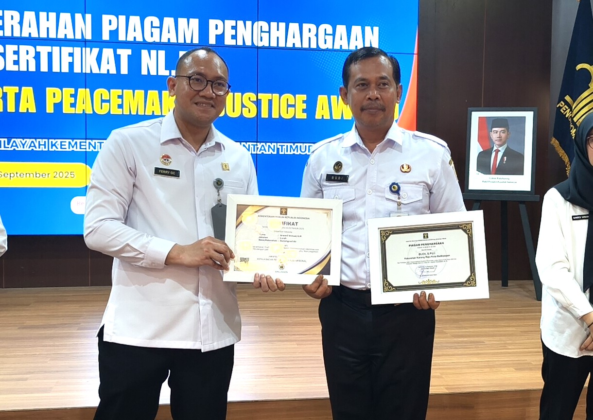 Prosesi penyerahan penghargaan berlangsung pada Rabu (17/9/2025), dipimpin langsung oleh Kepala Kantor Wilayah Kementerian Hukum Kalimantan Timur, Muhammad Ikmal Idrus, didampingi Kepala Divisi Peraturan Perundang-Undangan dan Pembinaan Hukum, Ferry Gunawan C.