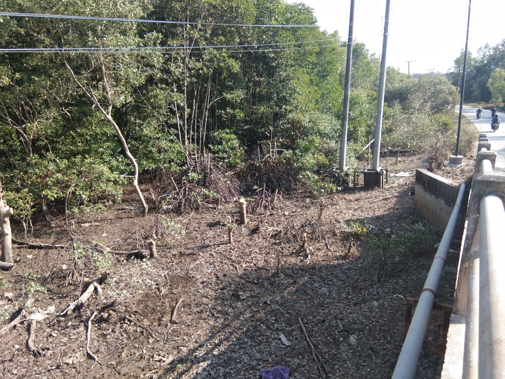 Dari foto yang ditunjukan, terlihat pohon mangrove dipangkas habis sepanjang jalur kabel listrik, padahal untuk menanam hingga pohon mangrove tumbuh tinggi membutuhkan waktu lama.