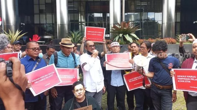 Dalam aksinya, mereka menuntut Ketua KPK Firli Bahuri dipecat dan segera ditindak pidana atas dugaan membocorkan dokumen penyelidikan kasus korupsi di Kementerian ESDM.