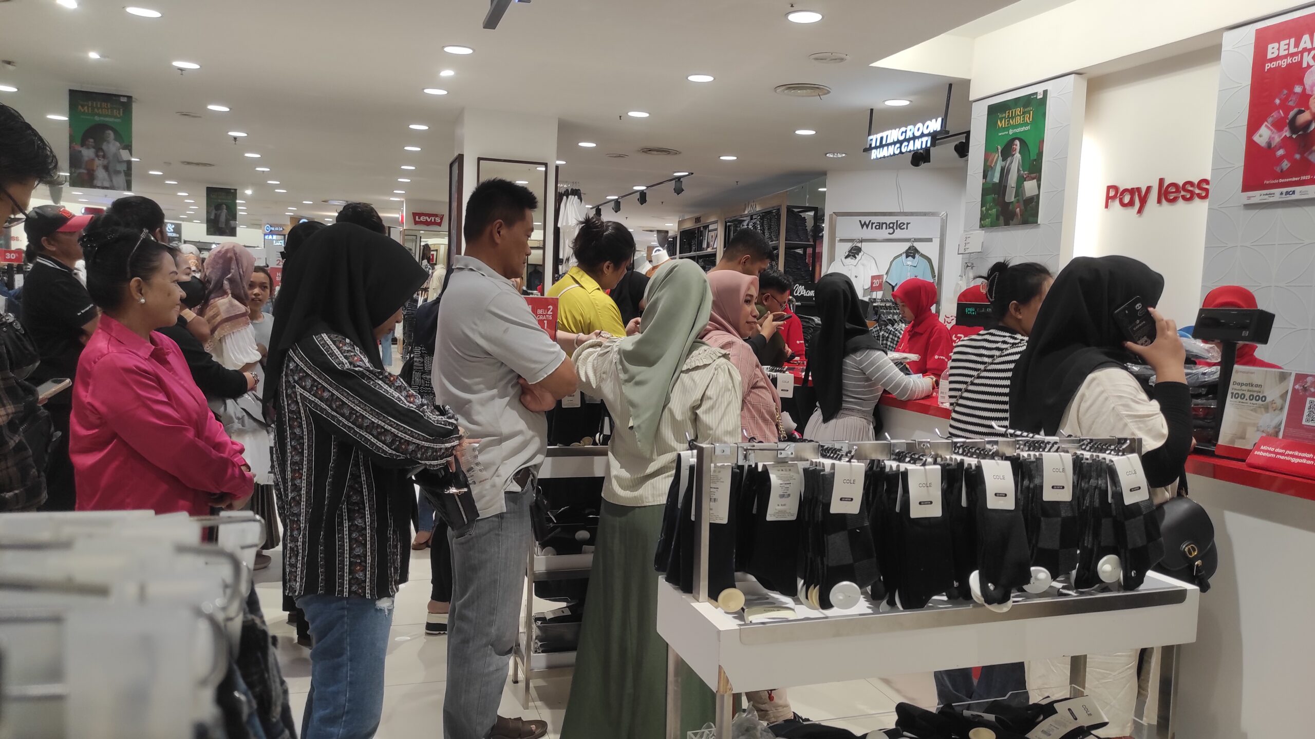 ” Lebih dari 10 menit. Laamanya saat cari baju yang dibeli, ” ucap warga yang ikut dalam antrian di kasir Matahari, Sabtu (30/3/2024)sore.