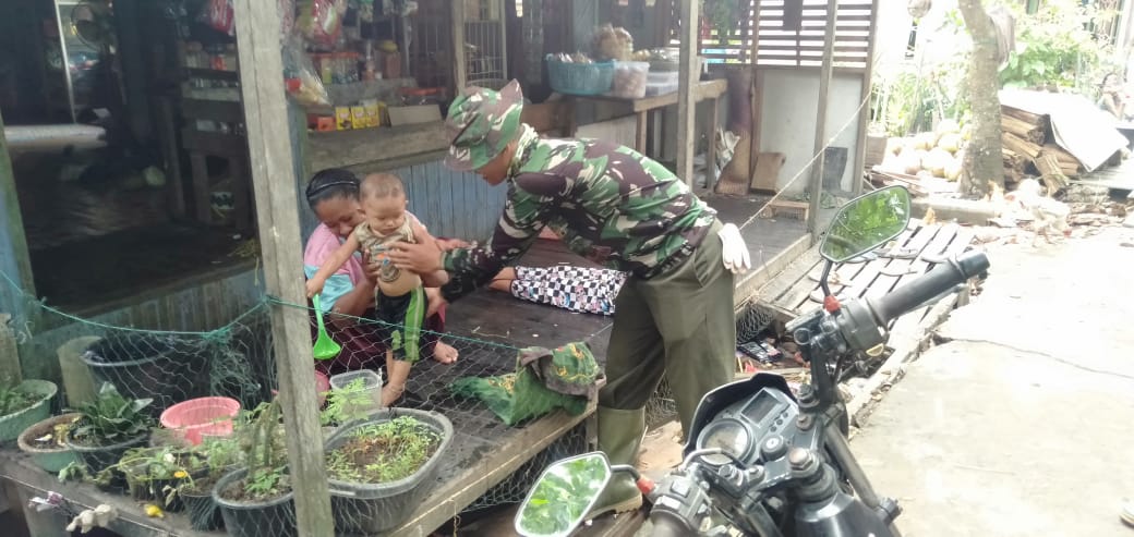 Di sela-sela istirahat siang sejumlah anggota Satgas TMMD menghampiri rumah warga yang mempunyai anak balita pada Sabtu (11/7/2020). Mereka pun menggendong balita tersebut untuk menjalin silaturahmi sekaligus melepas rindu kepada keluarga terutama anak yang ditinggalkan selama melaksanakan tugas TMMD.