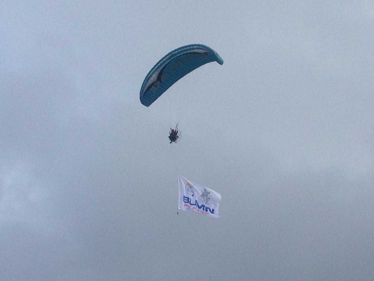 Penerbangan para motor dua penerbang paramotor berhasil lepas landas dengan mulus dan mengibarkan spanduk raksasa BUNM Hadir Untuk Negeri dan HUT ke 74 RI.