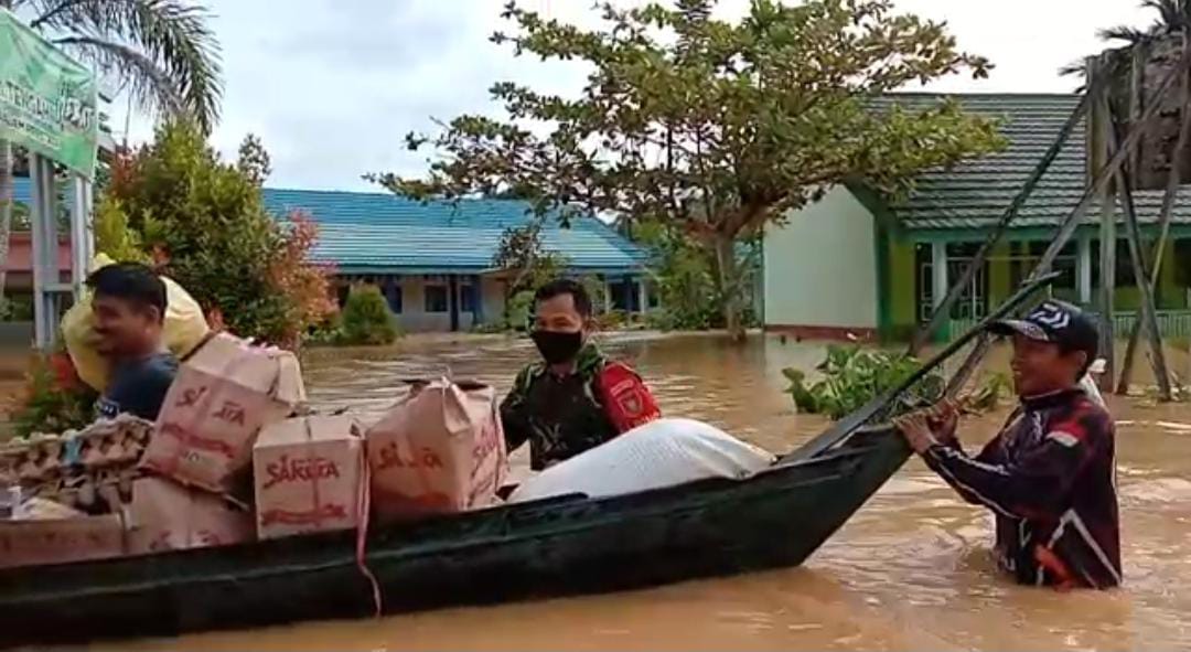 Dengan memaksimalkan anggota Babinsa dilapangan, anggota TNI dan relawan berjibaku dengan air banjir untuk mengantar logistik.”ucapnya.