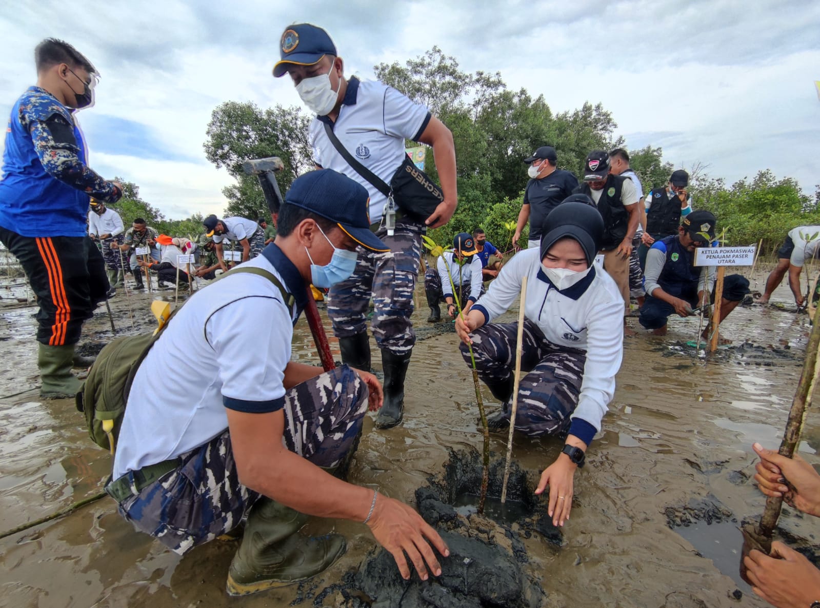 BALIKPAPAN,Inibalikpapan.com — Dalam rangka menyambut HUT Armada Republik Indonesia tahun 2021, Pangkalan TNI AL Balikpapan beserta instansi maritim, TNI POLRI dan seluruh warga desa pesisir yang berada di Kabupaten Penajam Paser Utara bersama sama melakukan penanaman 500 pohon mangrove. Sabtu, (4/12/2021).