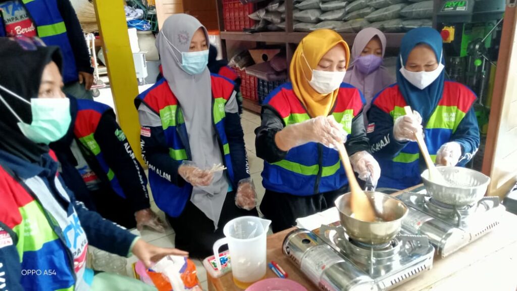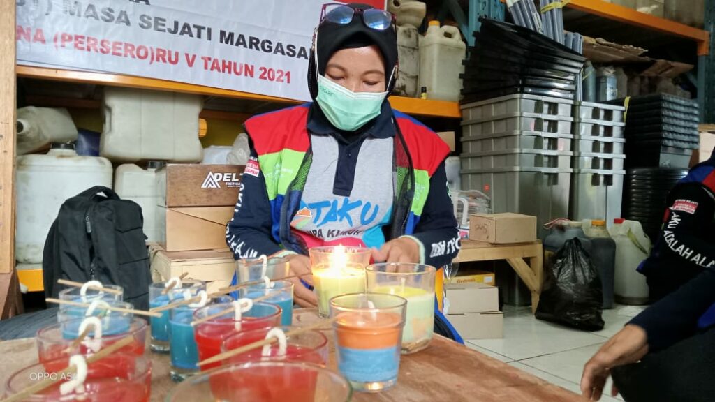 Saat kami mendatangi, ibu-ibu dengan mudah memperaktekan cara mengolah limbah minyak jelantah menjadi lilin cantik. Sekitar 20-30 menit proses pembuatannya hingga menghasilkan lilin.