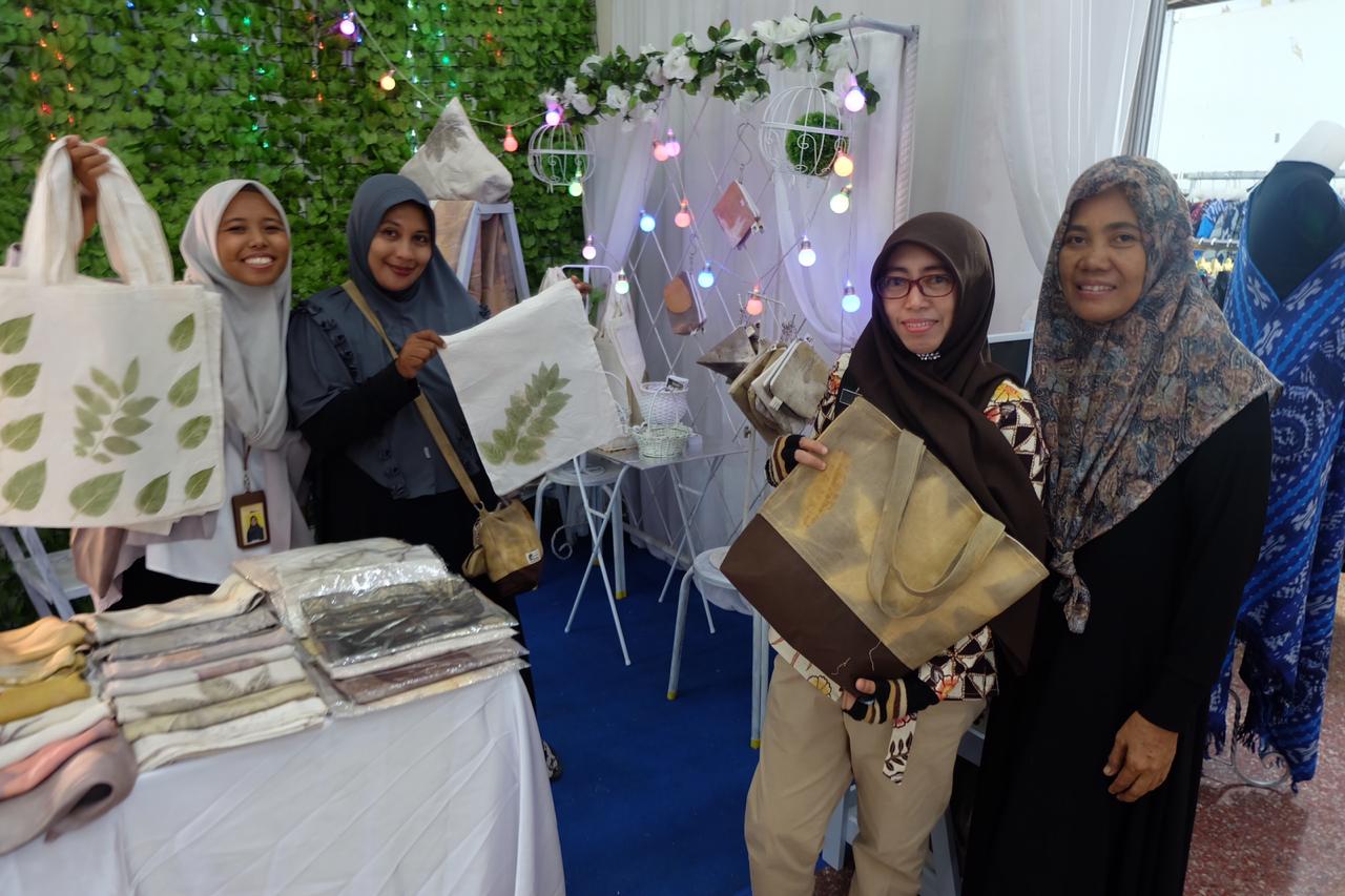 Antusiasme ibu-ibu Kelompok Matahari dalam memasarkan Batik Daon Jajar sebagai produk eco-printing ramah lingkungan, seperti jilbab, syal, tas, pouch dan goodie tampak semakin menarik pengunjung.