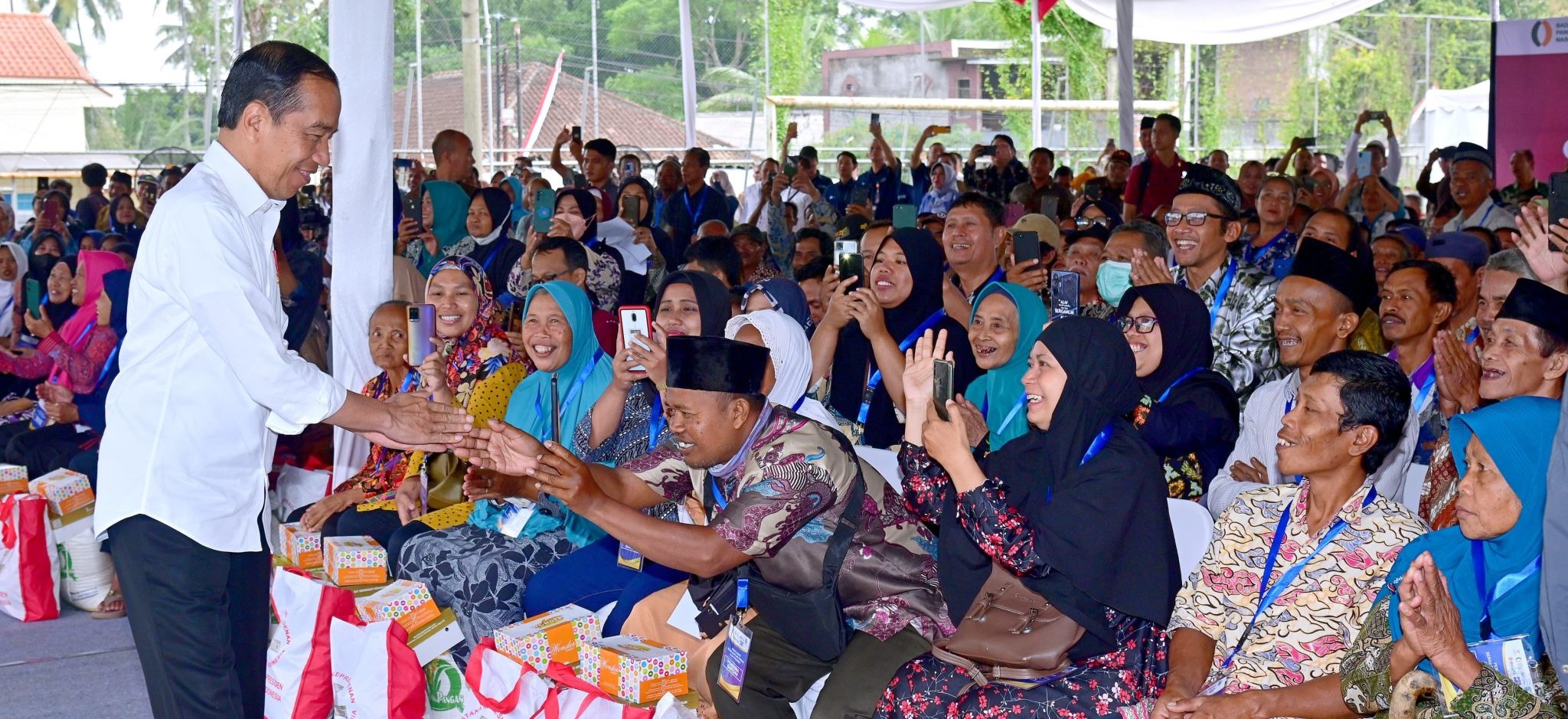 “Hari ini adalah hari pertama bantuan pangan kita berikan, ibu-ibu sudah dapat semua yang 10 kilo?” tanya Presiden kepada para penerima manfaat yang hadir.
