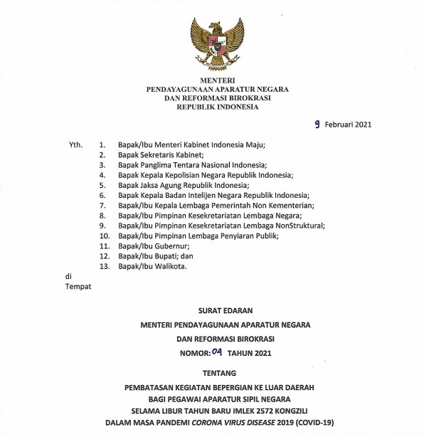 JAKARTA, Inibalikpapan.com – Menteri Pendayagunaan Aparatur Negara dan Reformasi Birokrasi (PANRB) Tjahjo Kumolo melarang aparatur sipil Negara (ASN) berpergian keluar daerah saat libur Imlek yang berlalu pada periode 11-14 Februari 2021.