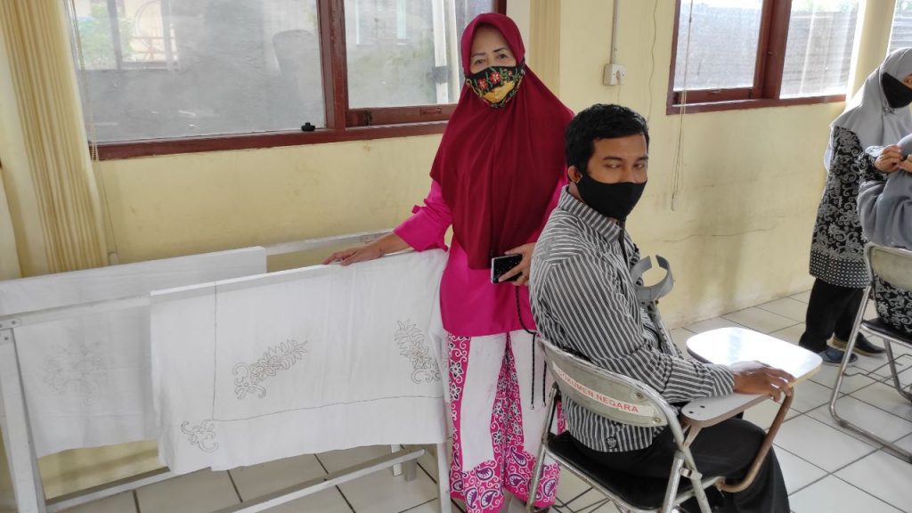 “Kebetulan pembina disabilitas Ibu Ety Nuzulianti almarhum, dia yang mengenalkan tentang batik, saya sampai disekolahkan ke Jogyakarta. Di Jogya saya kurang lebih 3 mingguan ditanggung almarhum ,” ceritanya.