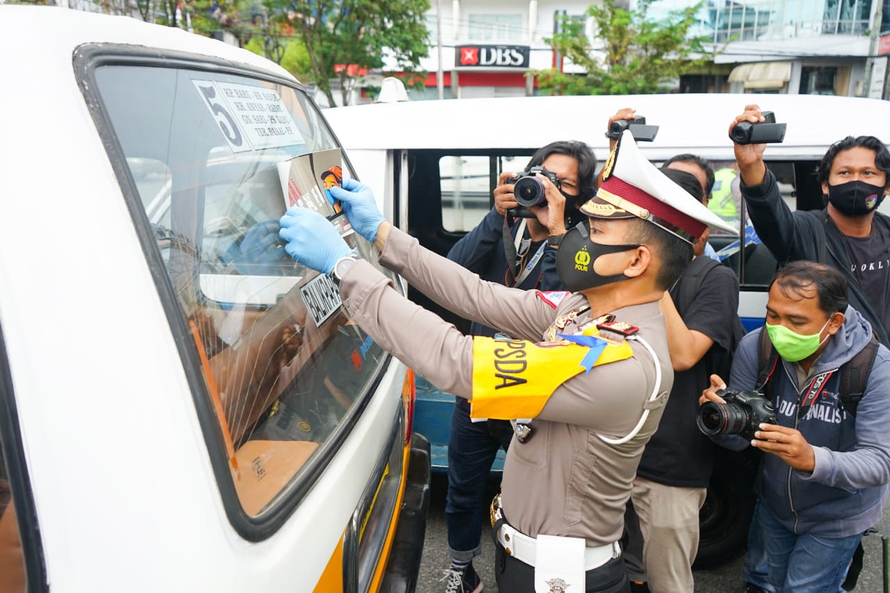Usai pembukaan Operasi Zebra Mahakam, Dirlantas Polda Kaltim Kombes Pol Singgamata didampingi Kasat Lantas Polresta Balikpapan menempelkan stiker dan membagikan masker ke puluhan transportasi umum, daring, dan swasta yang melintas di kawasan Jalan Jenderal Sudirman, tepatnya di halaman Bank Bukopin Balikpapan Permai (BP), Senin (26/10/2020) sekitar pukul 17.00 Wita.