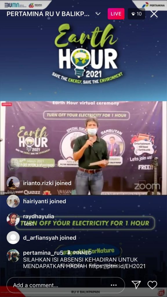 Selain kegiatan pemadaman, juga dilakukan kegiatan berbagi cerita mengenai aktivitas kepedulian lingkungan dengan menghadirkan Putri Indonesia Lingkungan 2020 Putu Ayu Saraswati secara langsung via zoom dan live IG.