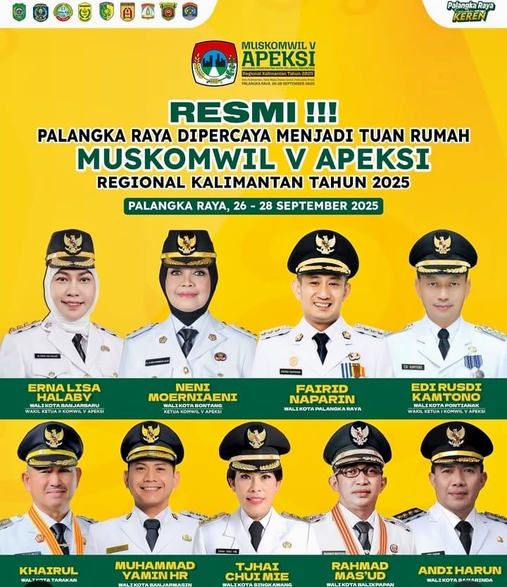PALANGKARAYA,Inibalikpapan.com – Kota Palangka Raya kembali dipercaya menjadi tuan rumah Musyawarah Komisariat Wilayah (MUSKOMWIL) V Asosiasi Pemerintah Kota Seluruh Indonesia (APEKSI) Regional Kalimantan tahun 2025. Kegiatan bergengsi ini akan digelar pada 26–28 September 2025.