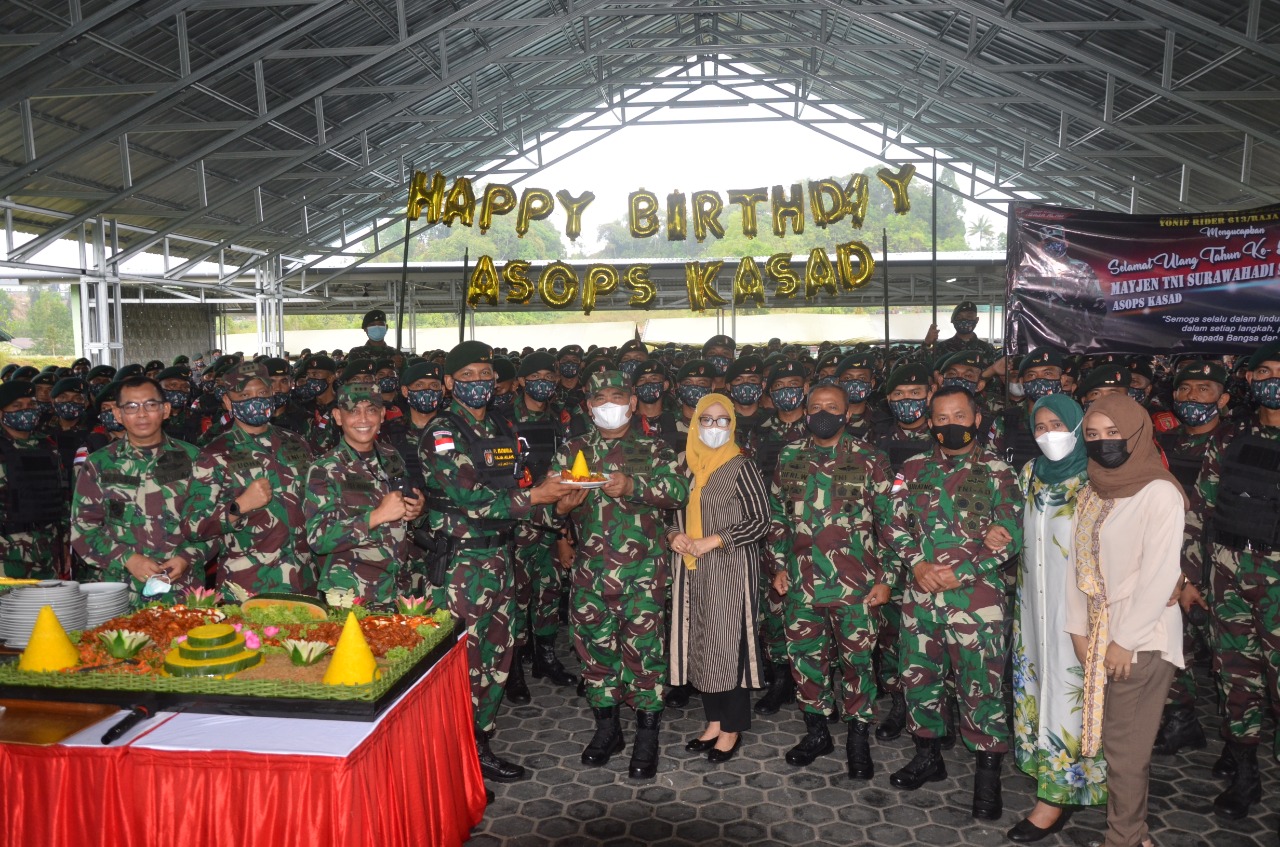 Asisten Operasi Kepala Staf TNI AD Mayor Jenderal TNI Surawahadi mendapat kejutan Ulang Tahun ke-58 dari Pangdam VI/Mlw Mayjen TNI Heri Wiranto, Jumat (26/03/2021), berupa pemberian hadiah kue ulang tahun dan Nasi Tumpeng.