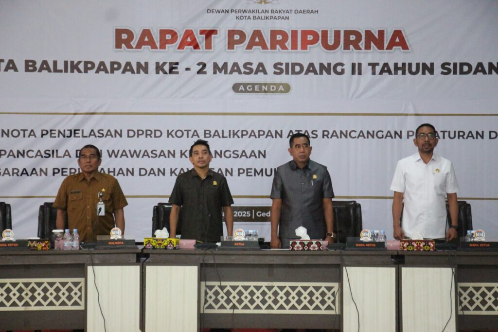 BALIKPAPAN,Inibalikpapan.com – DPRD bersama dengan Pemkot Balikpapan melaksanakan paripurna dengan agenda penyampaian nota penjelasan atas rancangan peraturan daerah (raperda) inisiatif DPRD. Tentang pendidikan pancasila dan wawasan kebangsaan dan raperda Serta penyelenggaraan perumahan dan kawasan pemukiman, Senin (3/2/2025).