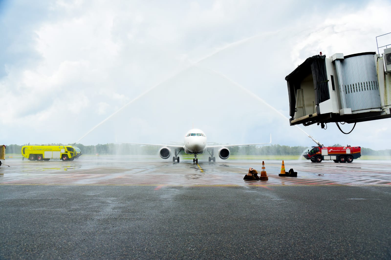 Pesawat Pelita Air tipe A-320 membuka rute baru Jakarta- Balikpapan- Jakarta. Pesawat mendarat perdana di Bandara SAMS Sepinggan pada pukul 09.57 WITA, mengangkut sebanyak 175 penumpang, Senin (20/3/2023).