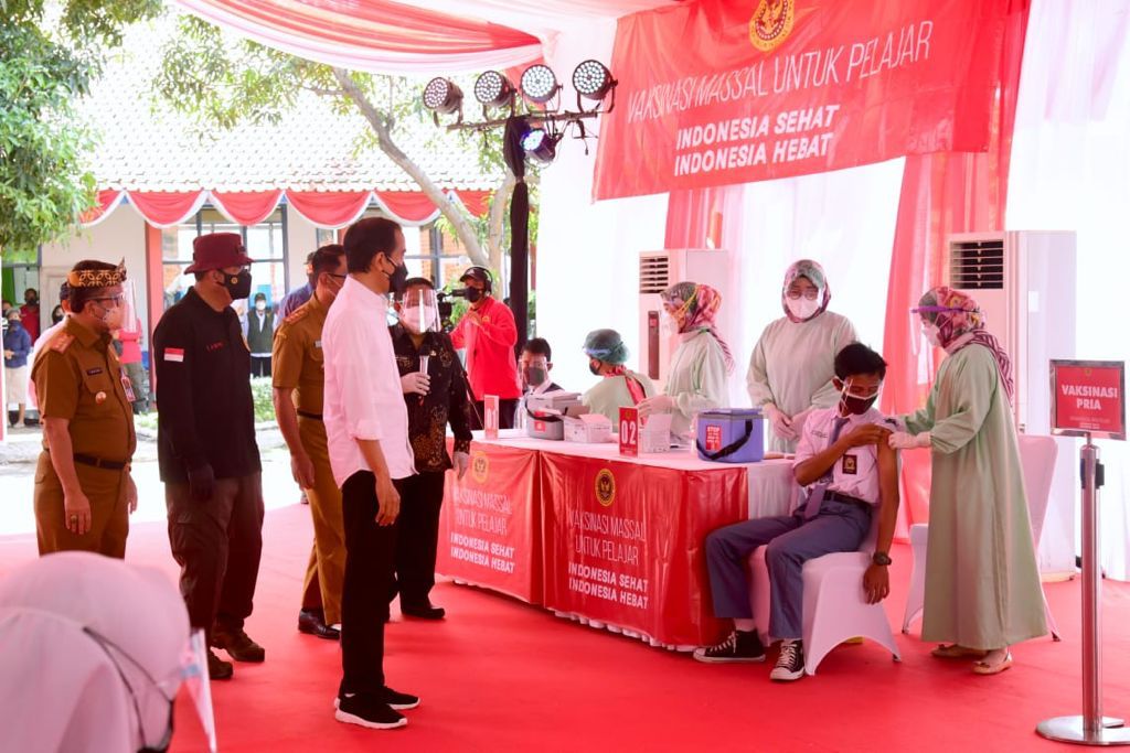 “Saya juga sudah perintahkan agar kegiatan vaksinasi bagi pelajar dan santri ini dilakukan secara besar-besaran, masif,” ,” ucap Presiden saat meninjau langsung program vaksinasi Covid-19 di SMAN 1 Beber, Kabupaten Cirebon, Selasa (31/08/2021)