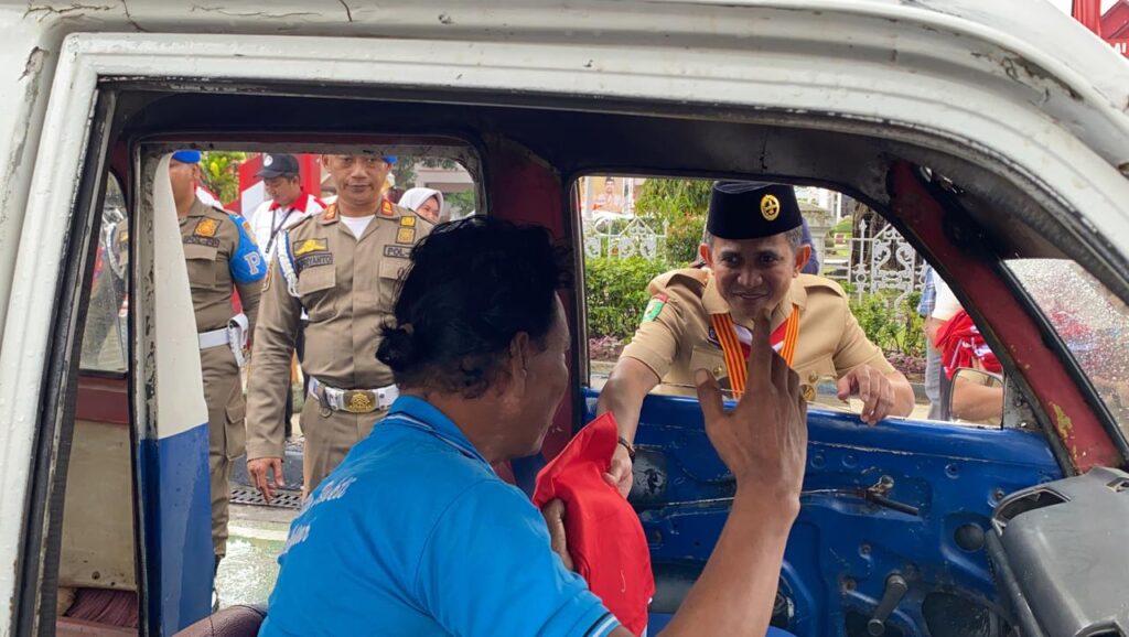 Bagi-bagi bendera dilakukan di depan Pemkot Balikpapan kepada pengguna jalan Jenderal Sudirman.