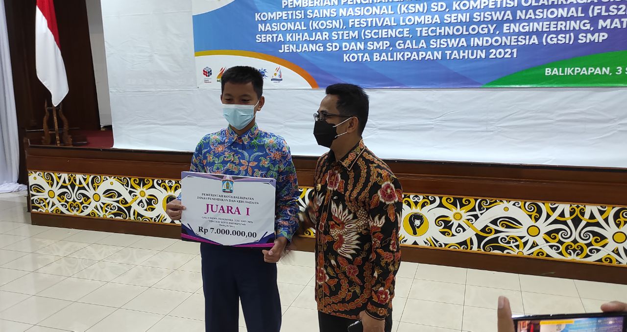 BALIKPAPAN, Inibalikpapan.com — Pemerintah kota Balikpapan memberikan apresiasi dan penghargaan kepada para pelajar dan siswa kota Balikpapan yang telah berprestasi dalam dunia pendidikan, pemberian penghargaan langsung diserahkan Wali Kota Balikpapan Rahmad Mas’ud kepada 23 siswa dari tingkatan SD dan SMP yang mengikuti lomba Kompetisi Sains Nasional, di Aula Kantor Walikota, Jumat (3/9/2021).