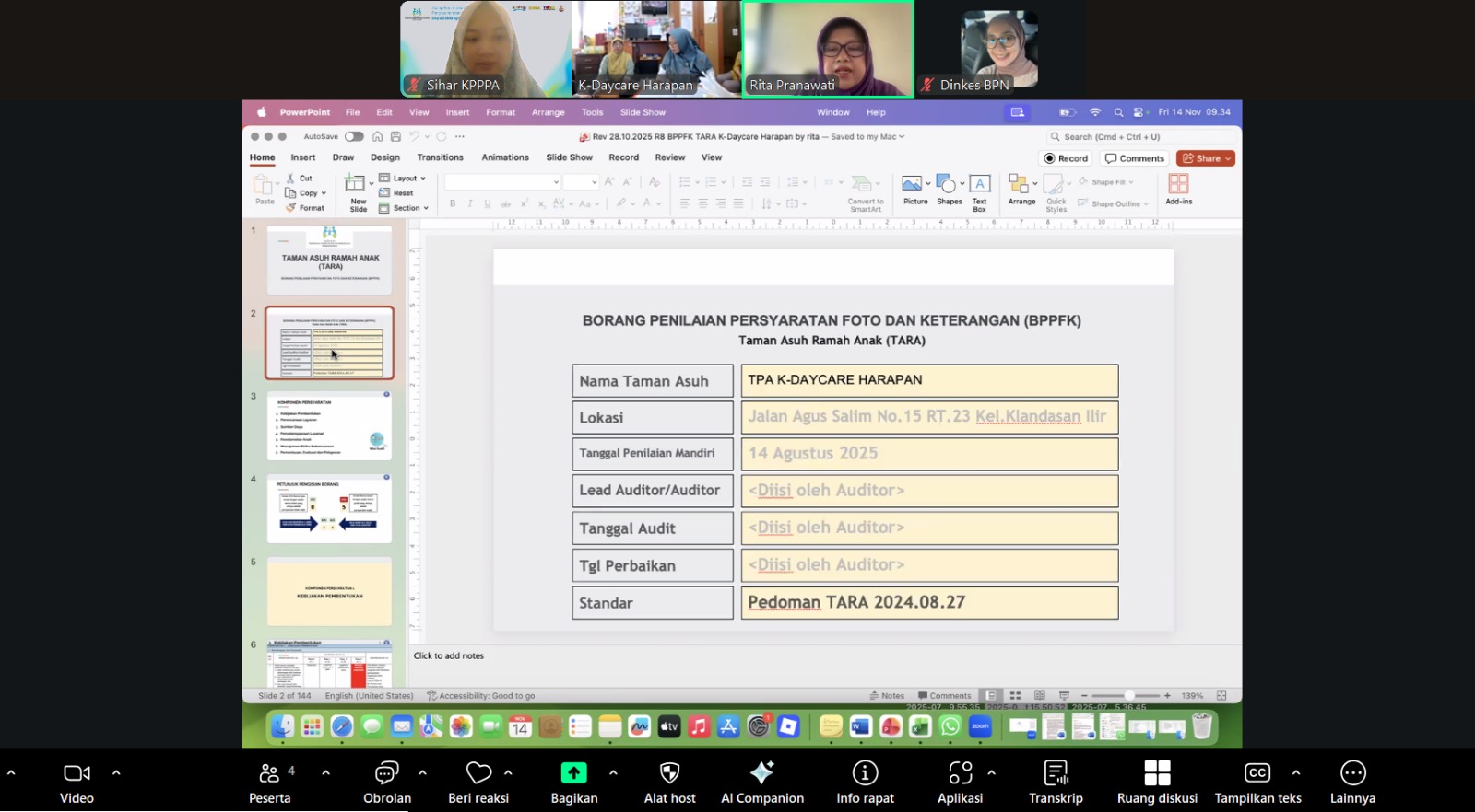 Pendampingan kedua ini secara khusus membahas “Pembahasan Borang Penilaian Persyaratan Foto dan Keterangan (BPPFK) Draf-2” untuk TPA K-Daycare Harapan Korpri.