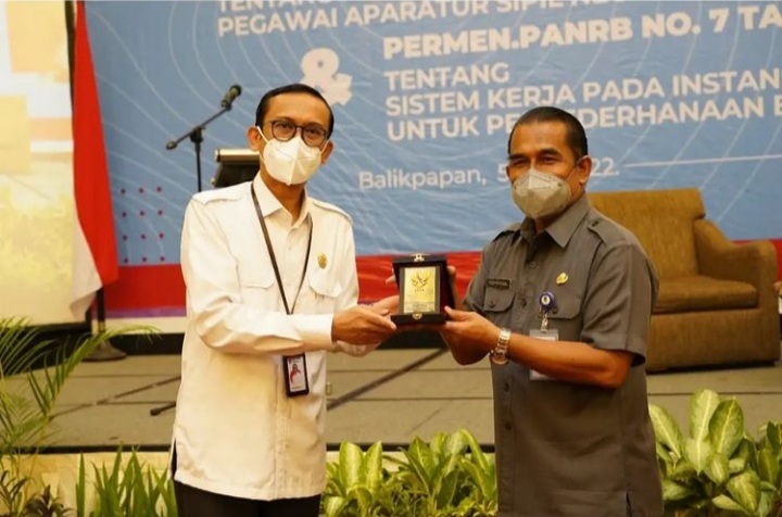 BALIKPAPAN,Inibalikpapan.com – Sosialisasi Permen PAN RB nomor 6 tahun 2022 tentang pengelolaan kinerja pegawai Aparatur Sipil Negara dan Permen PAN RB nomor 7 tahun 2022 tentang sistem kerja pada instansi pemerintah untuk penyederhanaan birokrasi dilaksanakan di Hotel Novotel Balikpapan, Selasa (5/7/2022).