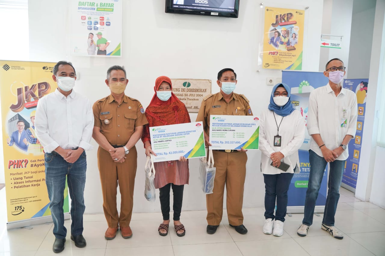 Pada kesempatan yang sama Direktur Umum dan SDM BPJAMSOSTEK bersama dengan Walikota Tarakan dr. H. Khairul, M.Kes juga menyerahkan santunan kepada ahli waris petugas kebersihan yang meninggal dunia karena kecelakaan kerja sebesar Rp202 juta, serta santunan kematian sebesar Rp42 juta kepada ahli waris peserta yang berprofesi sebagai ketua RT.