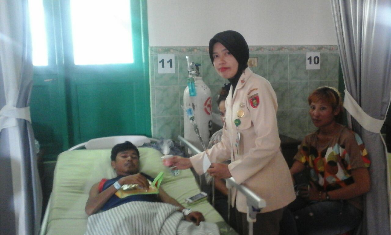ramah sembari memberikan sekuntum bunga. “Hari ini hari gizi nasional Pak,” ujar salah seorang perawat kepada seorang pasien yang dirawat di ruang Yudha 1 seraya memberikan sekuntum bunga, kue dan satu bingkisan lagi.