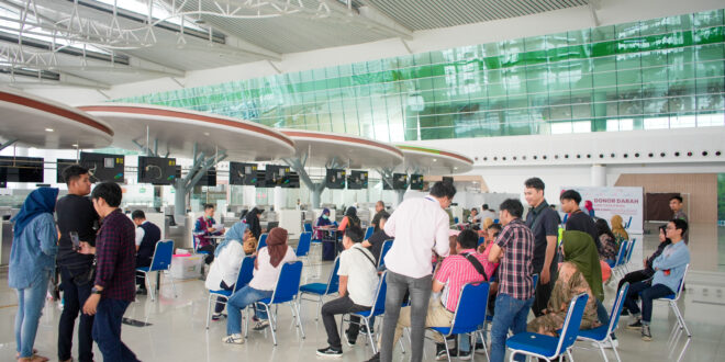 Di Bandara SMAS Sepinggan, Balikpapan, Kaltim, donor darah digelar di area chek in penumpang. kegiatan diikuti karyawan, stakeholder bandara.