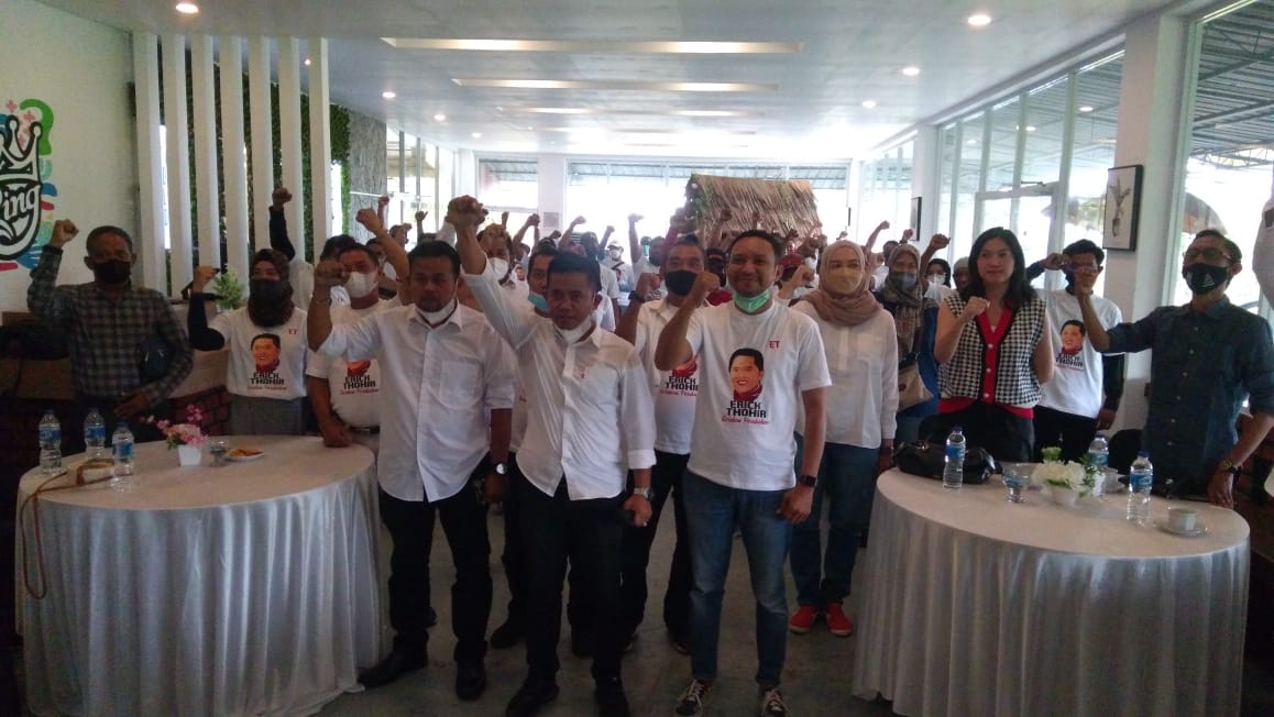 “Kami sebagai rakyat Indonesia melihat dan menyatakan sikap untuk mendukung Bapak Erick Thohir. Bukan atas perintah Bapak Erick Thohir, tapi murni dukungan relawan dan tidak akan melukai relawan,” imbuhnya.
